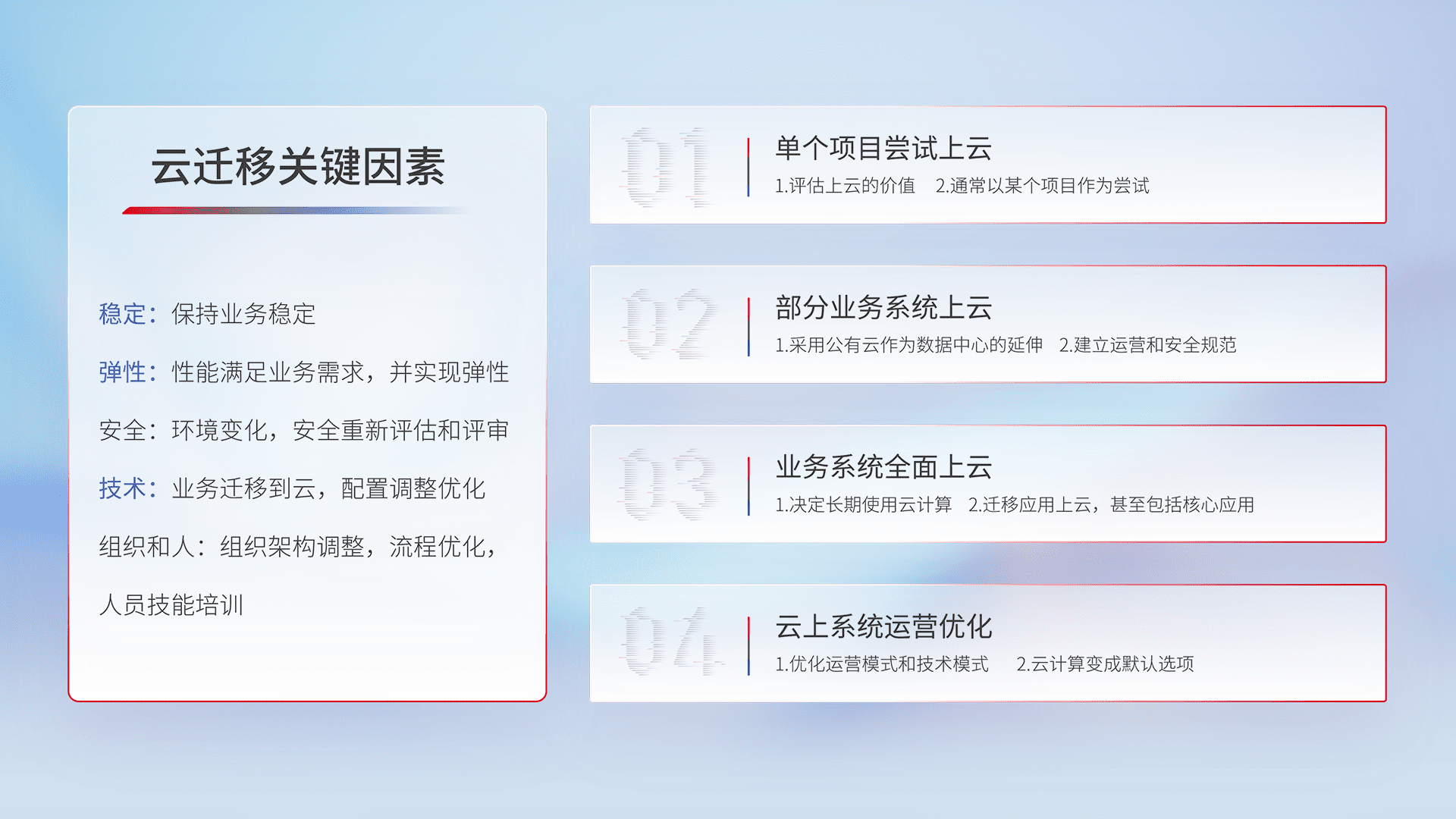 结合实际业务,,从规划设计、、云平台选型、、、、云原生改造、、、数据迁移、、集成交付,,,,迁移全过程为客户识别最佳上云路径,,,做好风险识别管理,,,,设计网络架构、、、身份权限、、安全审计合规、、、、操作审计、、日志审计、、、监控告警策略、、多站点容灾设计等,,对云上基础设施进行整体规划,,提升IT治理水平,,以满足弹性、、、高可用、、高性能的需求。。