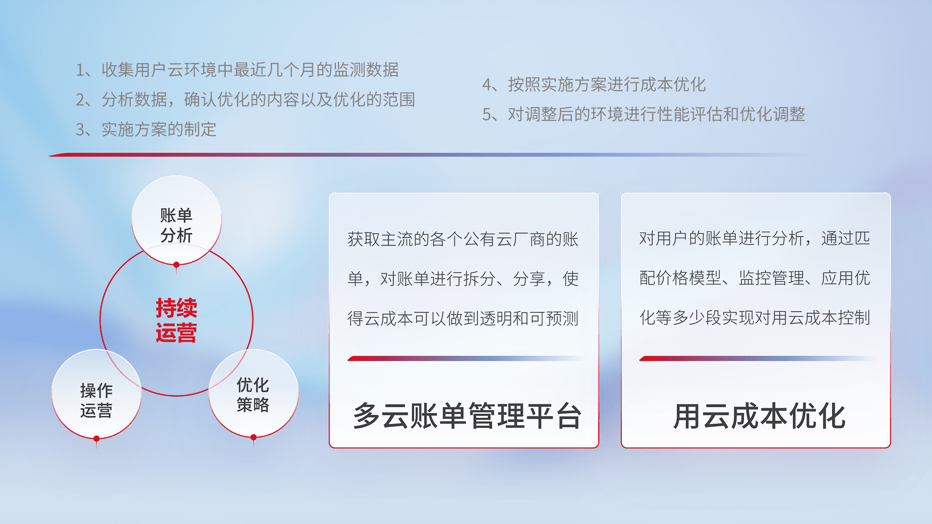通过多云纳管,,以统一的资源数据模型把客户的云资源进行抽象和封装,,进而实现对多云资源的统一操作,,,,保障云资源管理的可靠性、、稳定性与可用性。。。量身定制化运维内容,,配置、、开发运维、、补丁管理、、、备份、、监控、、、认证和访问管理、、、审计和日常巡检等,,保障在用云过程中的可靠度,,,,稳定度以及高可用率。。。