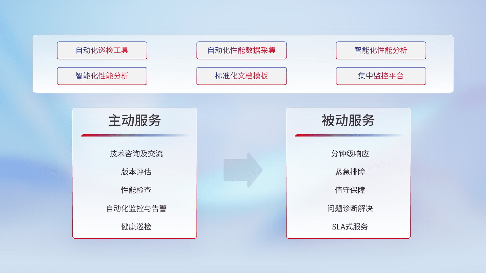 智能化工具和标准化文档,,,保障服务质量,,,,提供主动服务(包含技术咨询、、、、版本评估、、性能检查、、、自动化监控与告警、、、健康巡检)和被动服务包含(分钟级响应、、紧急排障、、、值守保障、、问题诊断解决、、、SLA服务)。。。
